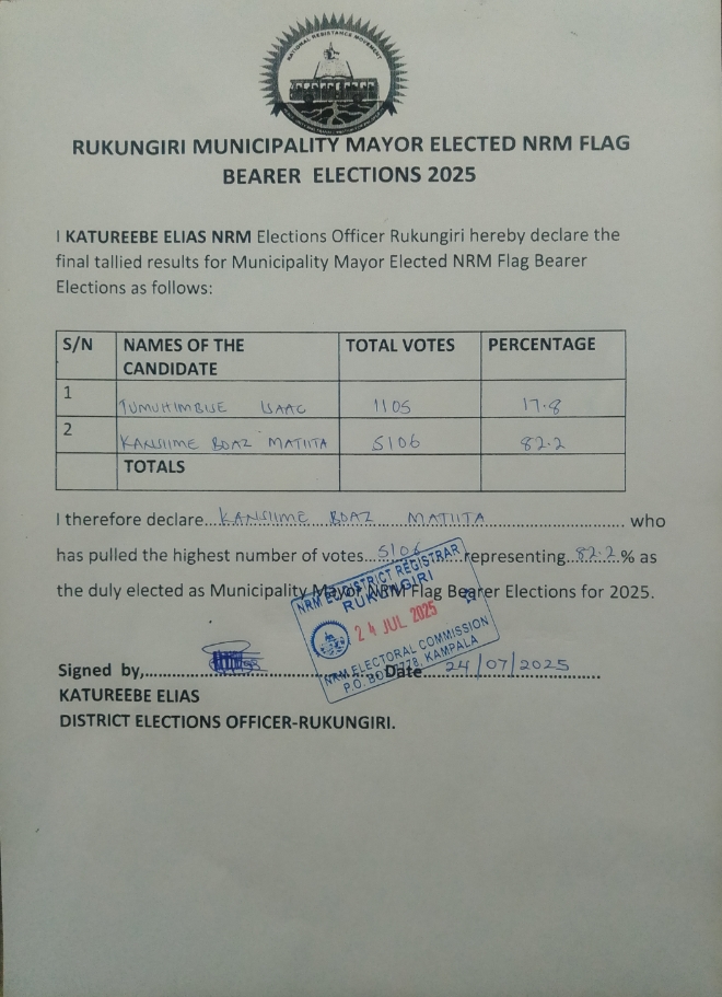 “This is not just my victory—it’s a victory for all of us who believe in a better, united Rukungiri Municipality,” he said. “Let’s keep the momentum. The journey to 2026 begins now, and I invite all NRM supporters, including those who didn’t vote for me, to join hands as we work for a stronger future.”