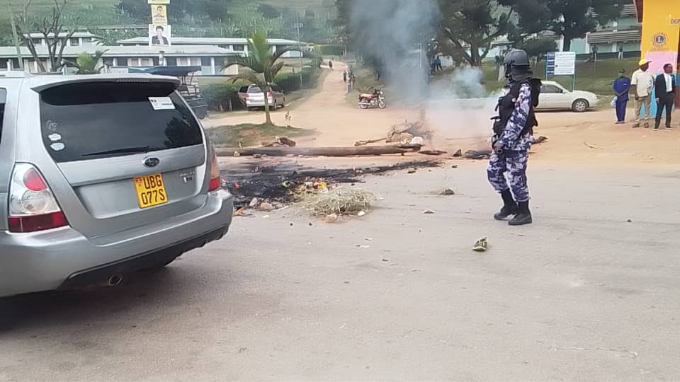 The angry residents blocked the Ntungamo–Mbarara highway by burning car tyres, dry grass, and fallen electricity poles, causing a traffic standstill until police intervened to disperse them and clear the road.