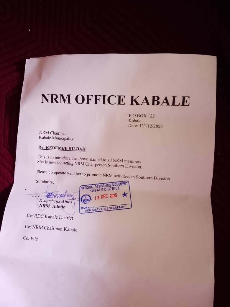 In a letter dated 13th December 2025, Kabale District NRM Administrator, Amos Rwansheija, appointed Hilda Kedembe as the acting NRM Chairperson for Southern Division. The move follows allegations against the substantive chairperson, Narasensio Tumwesigye, who party officials claim has acted contrary to the NRM’s code of conduct.