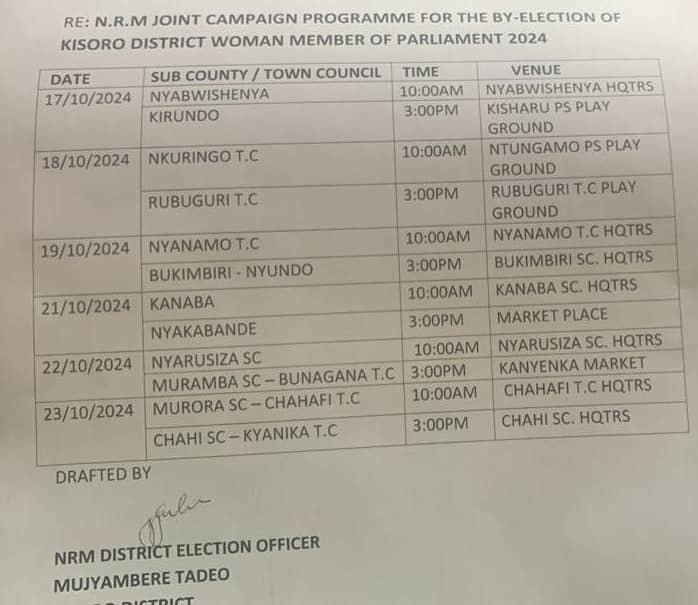 Before the Kampala meeting, the candidates had planned their fifth rally at Chahi Sub-county headquarters. Kisoro District NRM Election Officer Tadeo Mujyambere announced that the joint campaigns will now resume on Thursday at Nyabwishenya Sub-county headquarters and Kisharu Primary School playground.