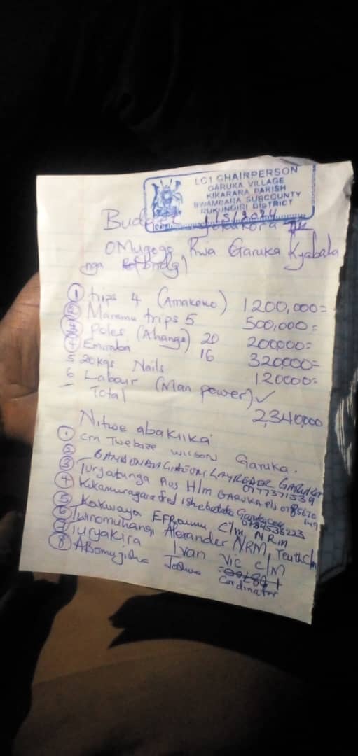 Residents of Garuka Cell in Kikarara Parish, Bwambara Sub County, Rukungiri District have initiated a fundraising campaign to gather 2,340,000/= (Two million three hundred forty thousand shillings) for the temporary repair of Rushaaya Bridge.
