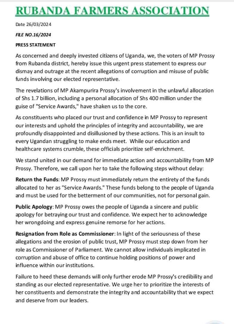 Furthermore, the Rubanda Farmers Association has called for MP Prossy to resign from her role as commissioner of parliament, citing the severity of the allegations and the erosion of public trust. They assert that individuals implicated in corruption and abuse of office cannot be allowed to retain positions of power and influence within the country’s institutions.