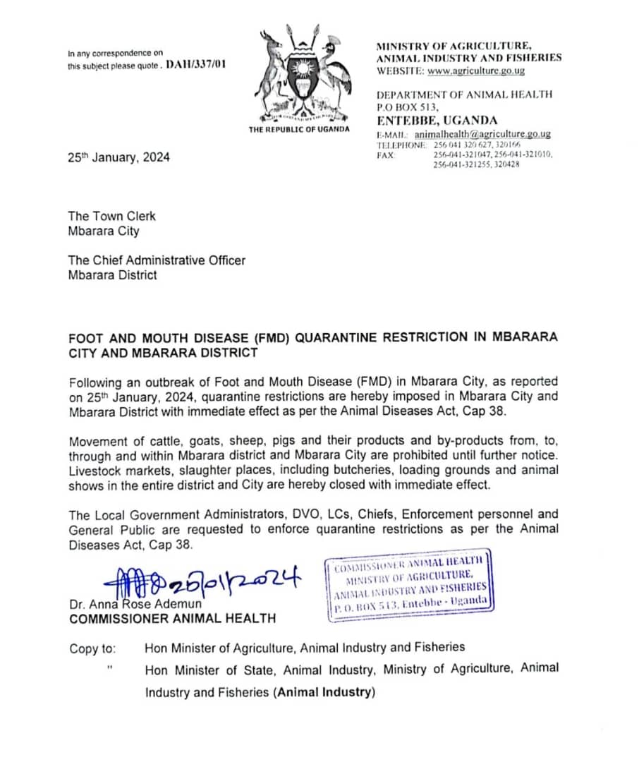 Citing the Animal Act, Cap 38, Ademun has enforced an immediate quarantine for Mbarara City and the larger district, prohibiting the movement of livestock and related products until further notice.