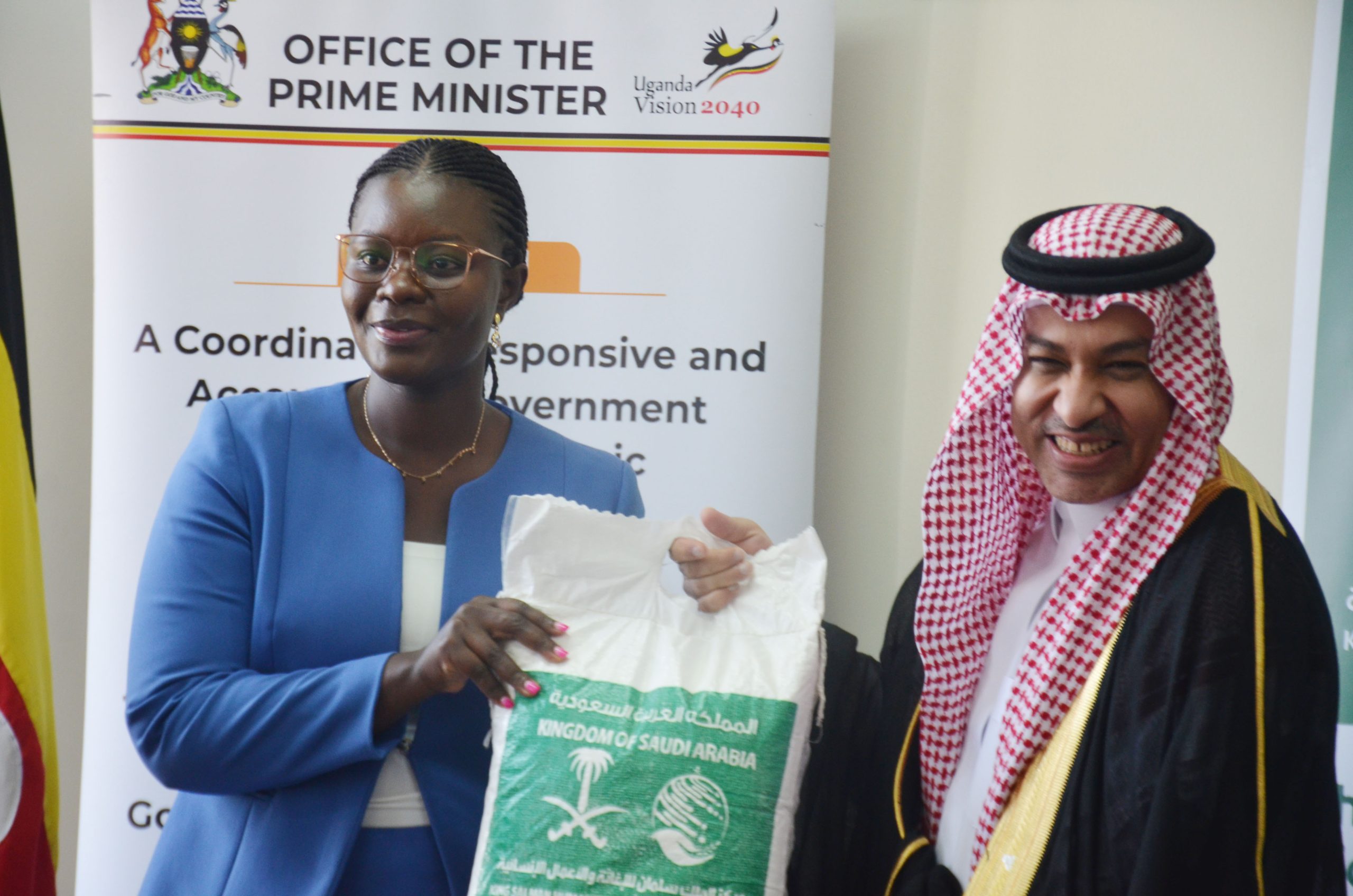 Okello conveyed his appreciation to the Kingdom of Saudi Arabia while representing the Minister of Relief, Disaster Preparedness and Management, and Refugees at the official handover ceremony of 342 tonnes of relief food, comprising 12,700 food boxes valued at USD 500,000, at Rubindi Zone in the Nakivale Refugee Settlement, Bukanga, Isingiro District, Southwest Uganda.