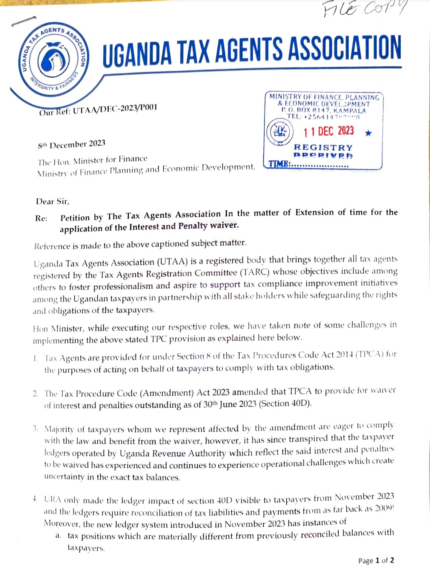 The Uganda Tax Agents Association has formally submitted a petition to the Ministry of Finance, Planning, and Economic Development, urging an extension of the deadline for the application of the Interest and Penalty waiver.
